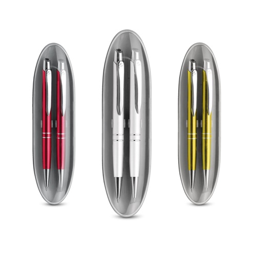 Set composto da una penna a sfera in metallo con refill blu e una matita portamine in confezione di plastica. Scatola: 174 x 22 x 46 mm