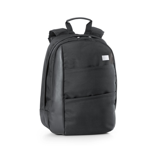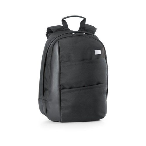 Zaino porta computer in similpelle e 1680D. Scomparto con divisorio imbottito per computer fino a 15.6’’. Tasche nel interno foderato e imbottito. Lo zaino ha 2 tasche frontali, una placca personalizzabile, schienale imbottito e cinghie imbottite. Capacità fino a 17 L. 340 x 450 x 130 mm | Targhetta: 40 x 20 mm