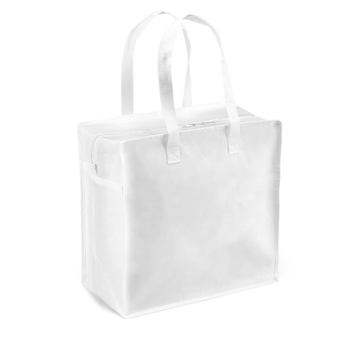 Borsa in TNT laminato (140 g/m²) con cerniera. Dotata di rinforzo sul fondo, manici in fettuccia di 65cm e fascia per il fisaggio al trolley. 350 x 350 x 200 mm