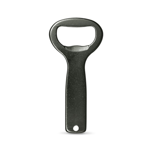 Apribottiglie in alluminio con foro all’estremità. 39 x 83 x 4 mm