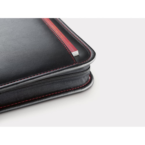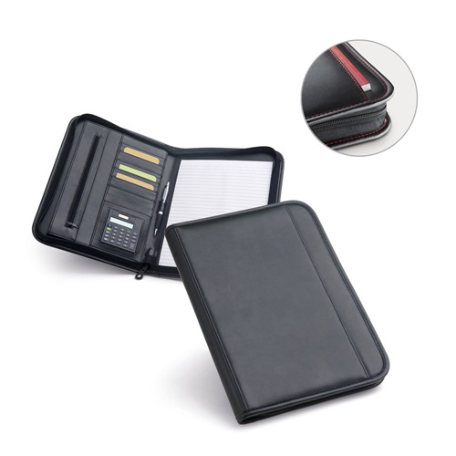 Cartella A4 in similpelle, con tasca frontale e zip. All'interno sono presenti diverse tasche e un portapenna (non inclusa). Contiene un blocco con 20 fogli a righe e una calcolatrice a doppia alimentazione a 8 cifre, con batteria LR1130 inclusa. 250 x 345 x 20 mm