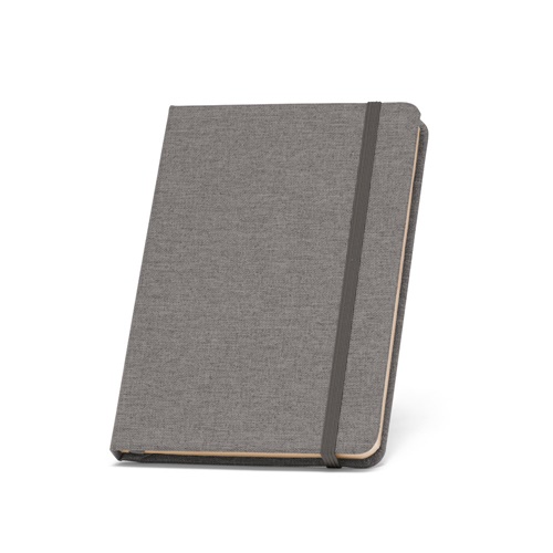 Blocco note A5 con copertina rigida in rPET. Contiene 192 pagine a righe con carta color avorio proveniente da una gestione forestale sostenibile, nastro separatore, elastico e tasca sul retro. 140 x 210 mm