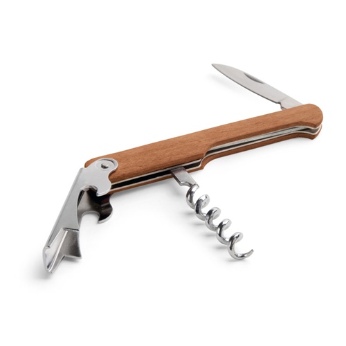 Cavatappi in legno con apribottiglie e coltellino. 109 x 25 x 8 mm