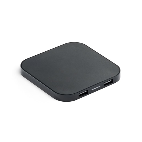 Caricatore wireless in ABS. Caratteristiche: input 5V/2A, output 5V/0'5-1A, 2 porte USB 2'0 e potenza di caricamento 5W. Include cavo USB/micro USB. Compatibile con smartphones con tecnologia wireless. 90 x 90 x 10 mm