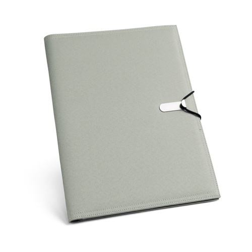 Cartella A4 in 600D con chiusura ad elastico. La cartella contiene un blocco di 20 fogli a righe, 3 tasche interne e un portapenna (non inclusa). 240 x 325 x 15 mm