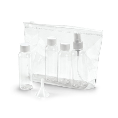 Sacchetto ermetico per cosmetici in PVC. Include 3 flaconcini (2 x 65 mL e 60 mL), 1 vaporizzatore (80 mL) e 1 imbuto. Adatto per il trasporto in cabina. 190 x 155 x 40 mm