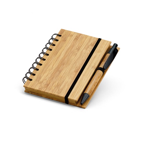Block notes A6 con spirale tascabile con copertina rigida in bambù, con 140 pagine a righe di carta riciclata e supporto per penna a sfera (inclusa). 105 x 148 mm