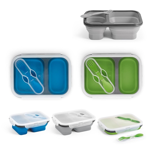 Contenitore ermetico in silicone e PP pieghevole con 2 scomparti con capacità fino a 480 mL e 760 mL. Include 1 posata 2in1, forchetta e cucchiaio. Rimosso il coperchio, il contenitore è adatto all’uso in microonde. 212 x 153 x 73 mm | Piegata: 212 x 153 x 38 mm