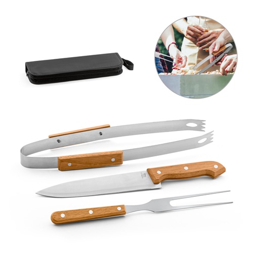 Set per barbecue composto da 3 utensili in legno e acciaio inox. Fornito in astuccio rigido in 210D. Custodia: 350 x 230 x 40 mm