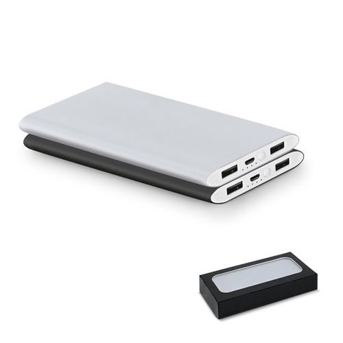 Batteria portatile in alluminio con batteria a litio, capacità di 7'200 mAh, entrata 5V/1A, uscita 5V/1-2'1A e 2 porte USB. Include un cavo USB/micro USB per caricare la batteria. Tempo di vita ≥ 500 cicli. Fornita in confezione regalo. 150 x 74 x 12 mm | Scatola: 165 x 80 x 20 mm