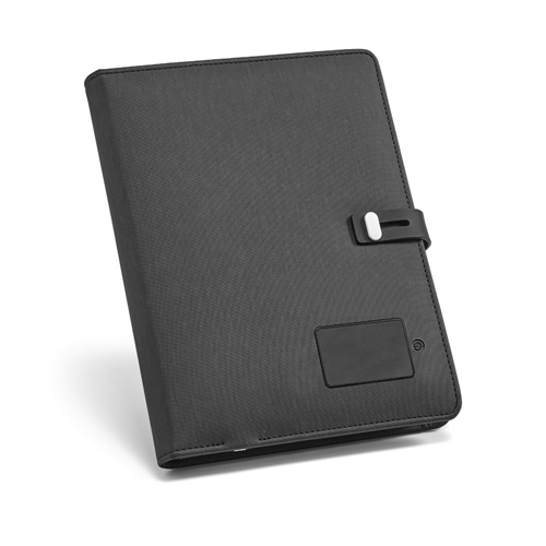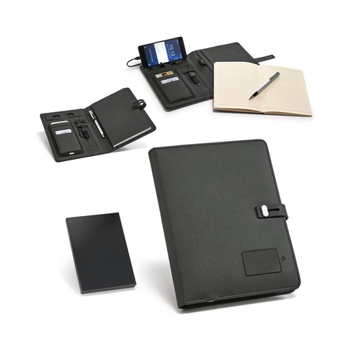 Cartella A5 in similpelle con batteria portatile incorporata. La batteria al litio ha una capacità di 4'000 mAh, durata ≥ 500 cicli, con ingresso/uscita 5V/1A e cavo USB/micro USB per caricare la batteria. Questa cartella contiene un supporto per penna a sfera (non inclusa), un blocco note rimovibile con 64 fogli a righe color avorio, diversi scomparti per facilitare l'organizzazione e il supporto di uno smartphone. All'esterno, placca personalizzabile con finitura gommata, led interno e pulsante on/off. Fornito in confezione regalo.165 x 225 x 25 mm | Placca: 55 x 35 mm | Confezione: 180 x 240 x 35 mm
