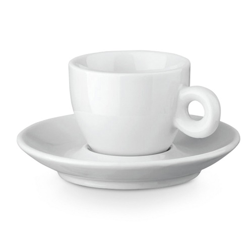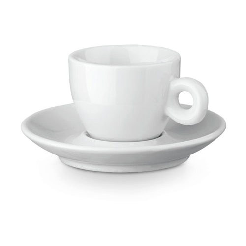Tazza e piattino in ceramica con capacità fino a 100 mL. Fornito in scatola. Tazzina: ø63 x 49 mm | Piattino: ø118 x 20 mm | Scatola: 122 x 122 x 66 mm