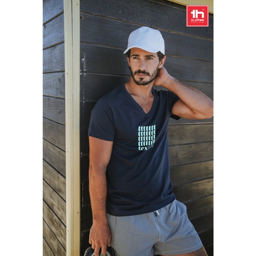 T-shirt da uomo tubolare e taglio regolare in jersey 100% cotone (150 g/m²) con filo in cotone cardato (colore: 194, 195 e 199: 60% cotone/40% poliestere). Girocollo in jersey con scollo a" V" rinforzato all'interno con nastro in jersey. Cucitura doppia sulle maniche e parte inferiore. Taglie: S, M, L, XL, XXL