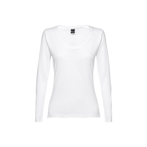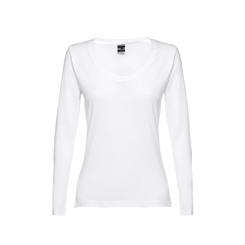 T-shirt a manica lunga da donna in jersey 100% cotone (150 g/m²) con filo di cotone cardato. Taglio moderno, colletto con nastro di rinforzo in jersey. T-shirt tubolare con taglio regolare e cucitura doppia su maniche e parte inferiore. Taglie: S, M, L, XL, XXL