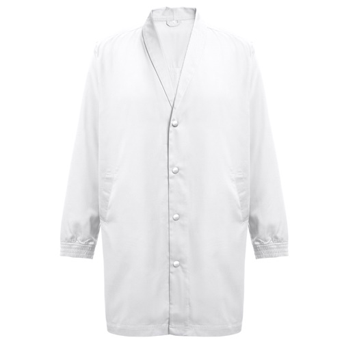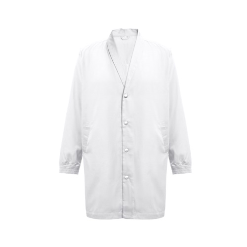 Grembiule da lavoro (unisex) in 20% cotone e 80% poliestere (190 g/m²). Taglio elegante e moderno, girocollo stilizzato con 2 tasche laterali. Polsini elasticizzati e abbottonatura automática a pressione. Apertura posteriore per una maggiore libertà di movimento. Taglie: S, M, L, XL, XXL, 3XL