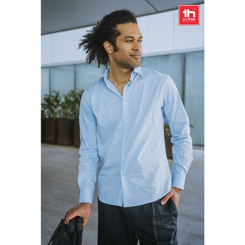 Camicia popeline a maniche lunghe da uona in 68% cotone, 28% poliammide e 4% elastan (115 g/m²). Maniche lunghe con una piega e polsini regolabili con 2 bottoni. Vestibilità aderente con 2 pinces posteriori. Abbottonatura con 7 bottoni in tinta. Taglie: S, M, L, XL, XXL
