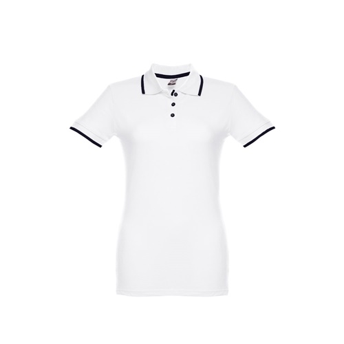 Polo bicolore a maniche corte da donna in piqué 100% cotone cardato (210 g/m²).Contrasto bicolore su girocollo, manica e abbottonatura. Girocollo e maniche a costine. Abbottonatura rinforzata con 3 bottoni a colore contrastante (bottone di riserva cucito all'interno). Vestibilità aderente con spacchetti laterali. Taglie: S, M, L, XL, XXL