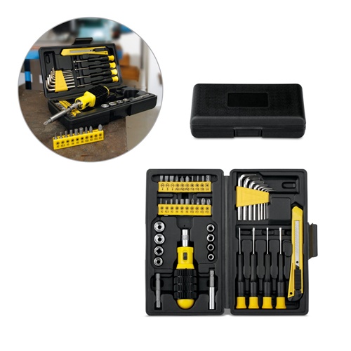 Set di utensili in acciaio carbonio e PE da 45 pezzi. Fornito in valigetta. 220 x 115 x 55 mm