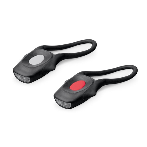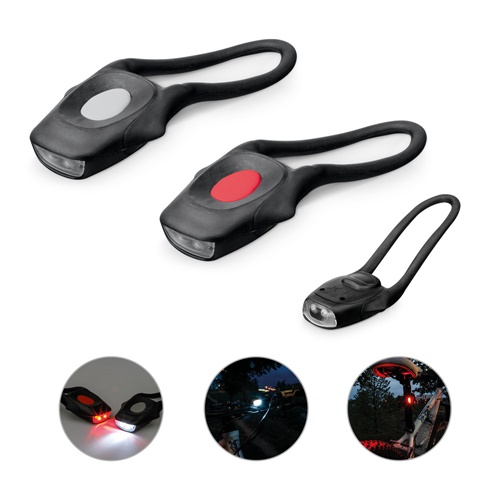 Set di 2 fari in ABS, con 2 LED rossi e 2 LED bianchi con funzione flash. Include 4 batterie al litio CR 2025. Set fornito in scatola. 80 x 52 x 22 mm