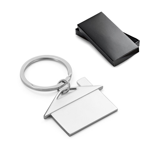 Portachiavi in metallo personalizzabile a forma di casa. Fornito in confezione regalo. 49 x 36 x 3 mm