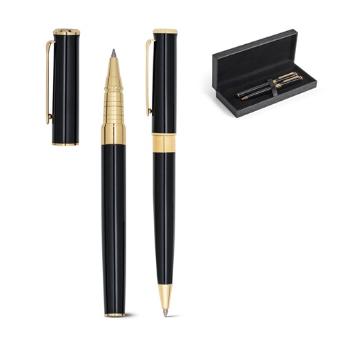 Set di penna roller e penna a sfera in metallo con elementi placcati oro 18 carati. Inchiostro nero. Fornito in una confezione regalo imbottita. ø12 x 136 mm | Custodia: 185 x 75 x 31 mm
