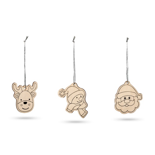 Set per dipingere su legno. Include 3 decorazioni natalizie con disegni da dipingere, con nastri da appendere e 4 matite colorate. 122 x 94 x 14 mm